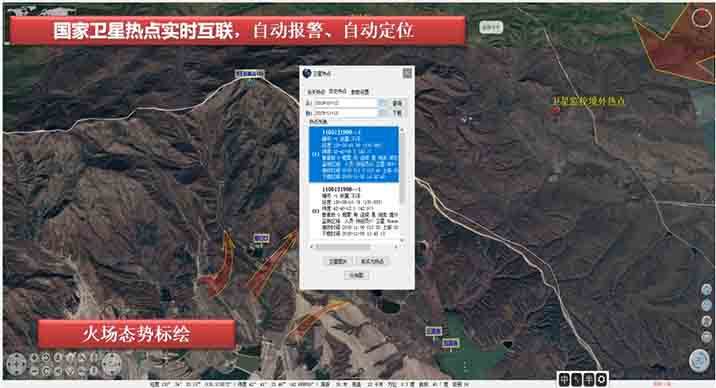 自動接收國家森防指衛(wèi)星監(jiān)測預(yù)警信息中心、省氣研所、中科院衛(wèi)星熱點,自動報警、自動標(biāo)注地圖、自動顯示。