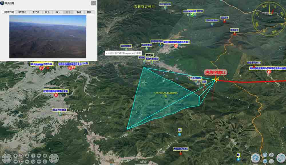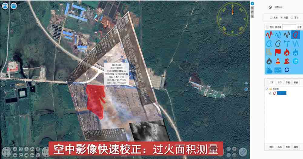無人機/有人機在空中拍攝的現(xiàn)場圖像快速校正疊加到地理信息上,實現(xiàn)火場現(xiàn)場的實況顯示,并實現(xiàn)火場、火線、火頭、火面等火場的測量和態(tài)勢生成。