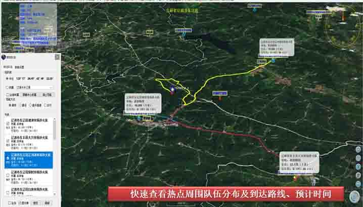 自動計算、統(tǒng)計熱點附近的隊伍,取水點、道路山形、林業(yè)資源等,自動計算前行路線,自動預(yù)計到達(dá)時間,指揮中心匯聚多方信息在高清三維GIS圖上,供決策使用。